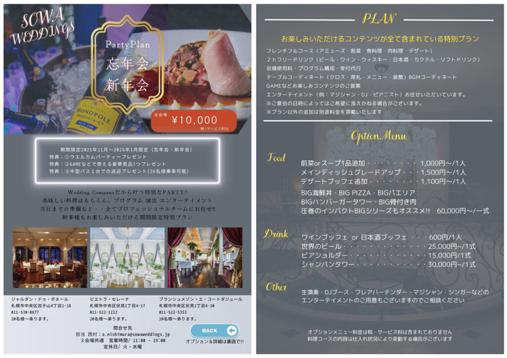 【SOWAレストラン】忘・新年会パーティプラン 2025-2026